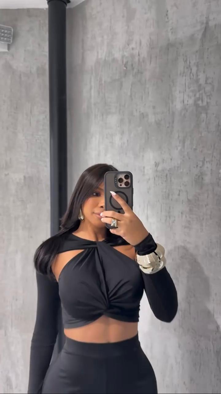 Compuesto por un crop top de manga larga con nudo central y un pantalón de tiro alto que alarga visualmente tu figura, este conjunto es el equilibrio perfecto entre sensualidad y elegancia.